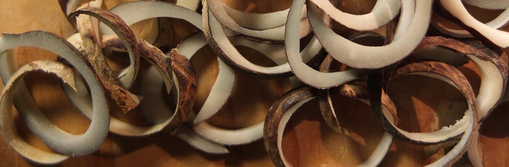 Utilizziamo questo materiale perché, essendo esso un frutto di un albero, si rigenera naturalmente secondo i ritmi della pianta e nessun albero viene tagliato, oltre a fornire una buona rendita economica per le popolazioni che la commerciano.